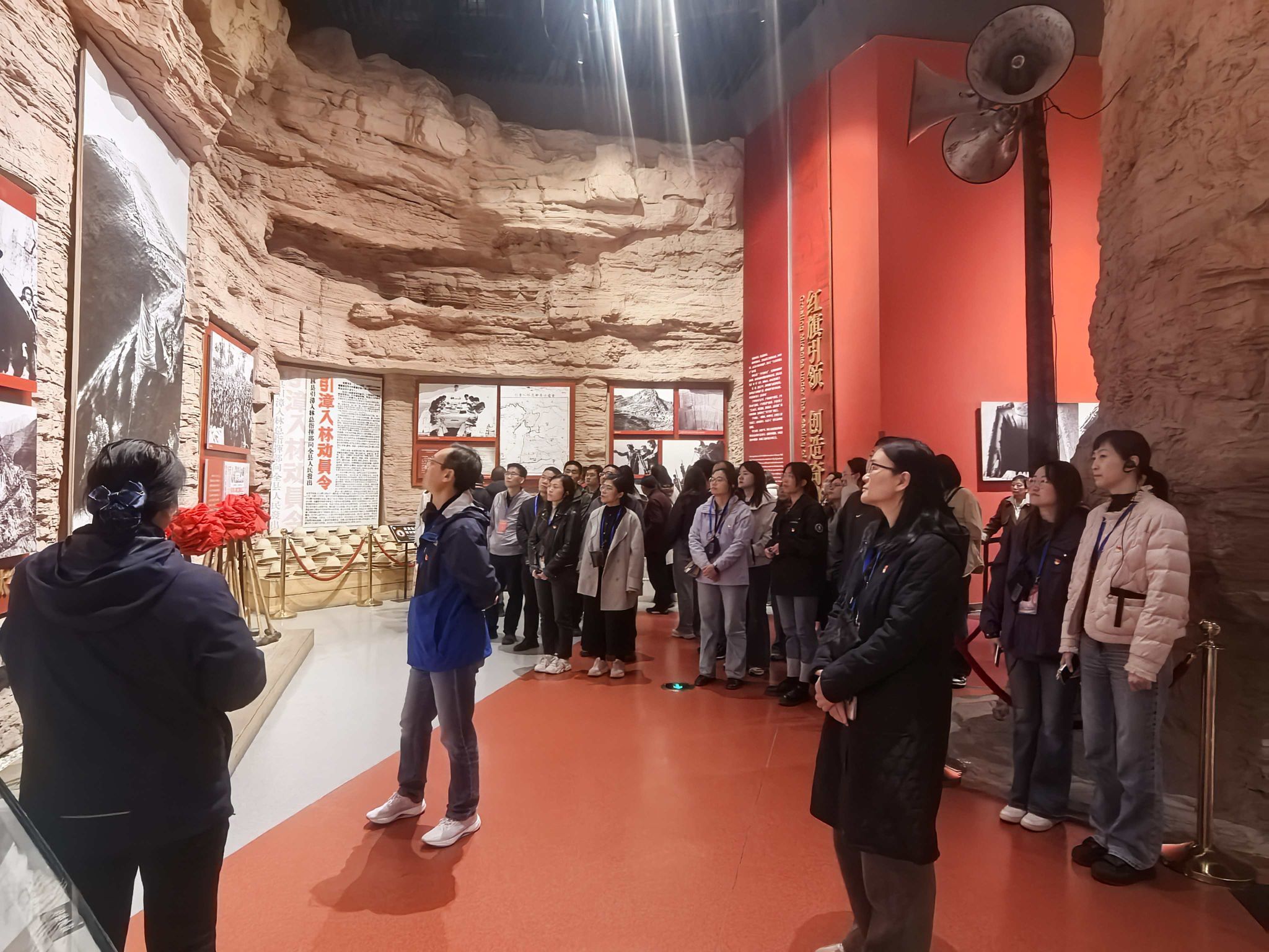 习近平总书记在河南安阳考察时指出:“红旗渠精神同延安精神是一脉相承的,是中华民族不可磨灭的历史记忆,永远震撼人心。”学院一行首先来到红旗渠总干渠上的咽喉工程——青年洞,行走在太行山悬崖峭壁的红旗渠畔,聆听着“劈开太行山,漳河穿山来”的动人故事,实地感受着修建红旗渠所遇到的艰险与挑战,更感受到林县人民齐心协力、劈山凿洞的精神品质。在青年洞前,全体党员驻足凝视峭壁上的凿痕与流淌的渠水,真切体会到“社会主义是拼出来、干出来、拿命换来的”精神内涵,对红旗渠精神的时代价值有了更深刻的认识。