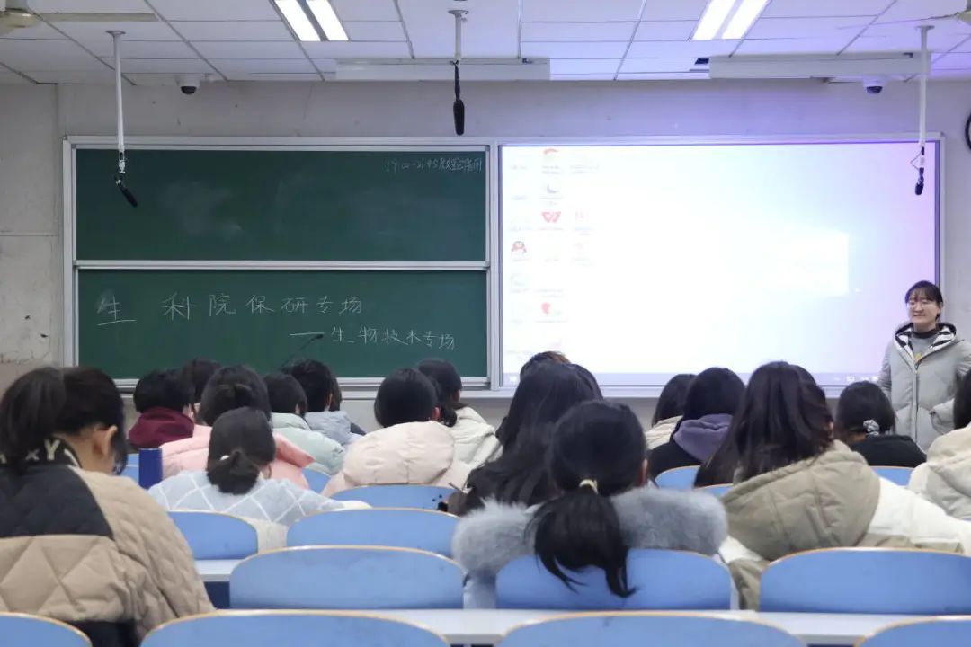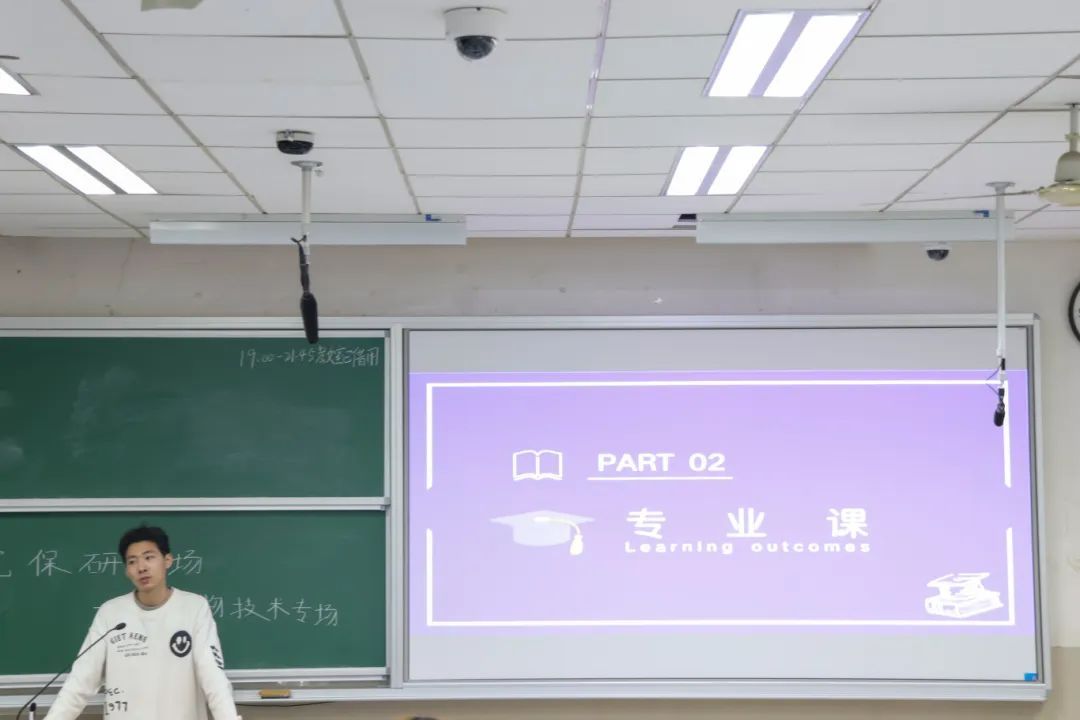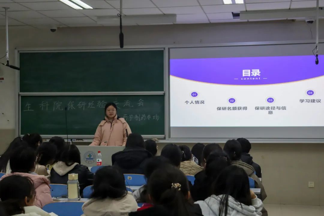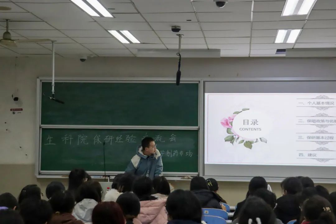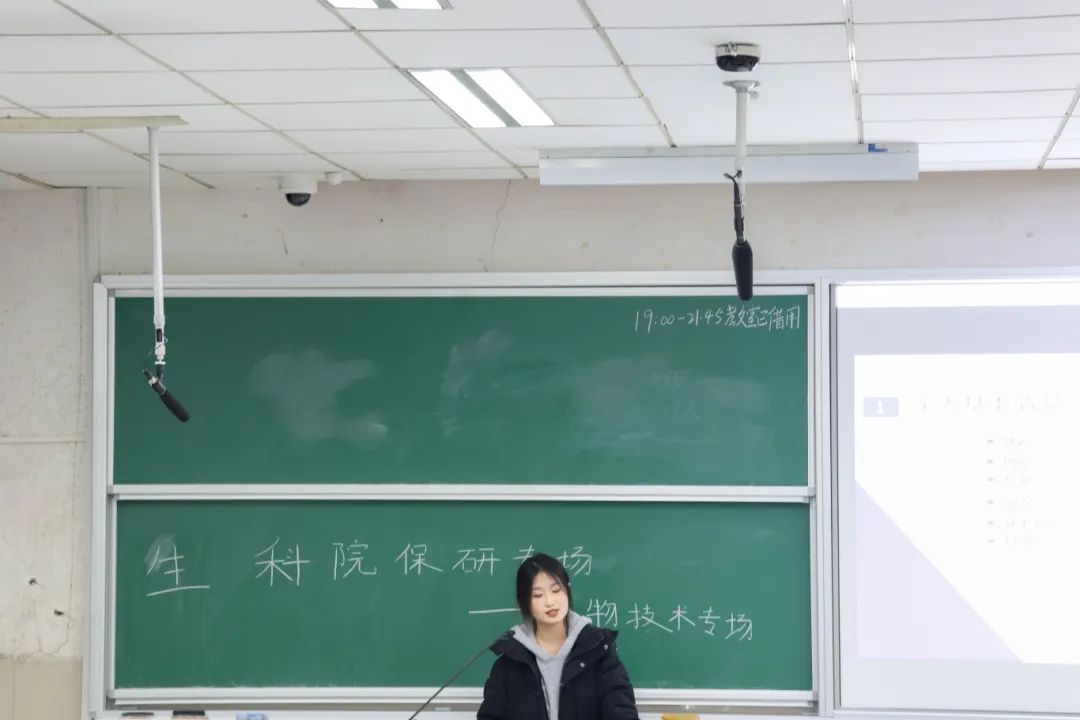 生物技术专业的宋俊辉同学提出保研的首要条件是学习成绩,而了解前沿科技,积极参加科创比赛也同样重要,这能在保研面试中为自己的简历增加一抹亮色。李枭婷学姐指出,有时选择是大于努力的,因此,在选择保研院校时查阅大量资料,多方比较,切忌好高骛远和妄自菲薄,选择最适合自己的院校。‍‍‍‍‍‍‍‍‍‍‍‍‍‍‍‍‍‍‍‍‍‍‍‍‍‍‍‍‍‍‍‍‍‍‍‍‍‍‍‍‍‍‍黄文慧学姐提到,保研是一条漫长的路,积极乐观的心态是必不可少的,凡事预则立,所以要提前准备保研所需的材料,做到有备无患。生物制药专业的周艺同学为大家解读了保研政策,着重强调了四六级的重要性,让与会同学对相关政策有了初步的了解。保研到山东大学的陶雪蕊学姐讲述了保研的流程,突出强调了专业课成绩在保研中的重要性。保研到北京协和医学院的张静学姐就本年级的保研名额进行介绍,就面试中遇到的问题与在座学生展开了交流。