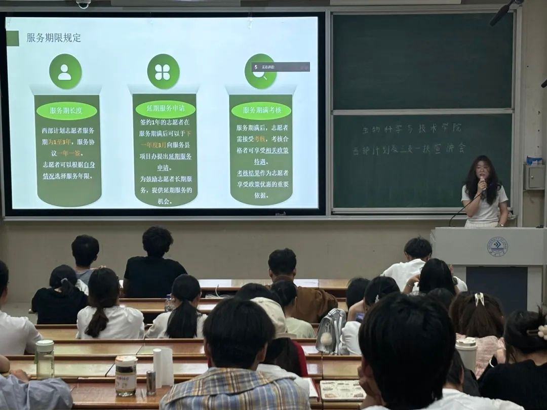 宣讲会上,宣讲人详细讲解了西部计划及三支一扶的招募条件、工作内容、服务期限、补贴待遇以及优惠政策等。结合实践案例,深入剖析政策要点,让同学们对相关政策有了初步了解。