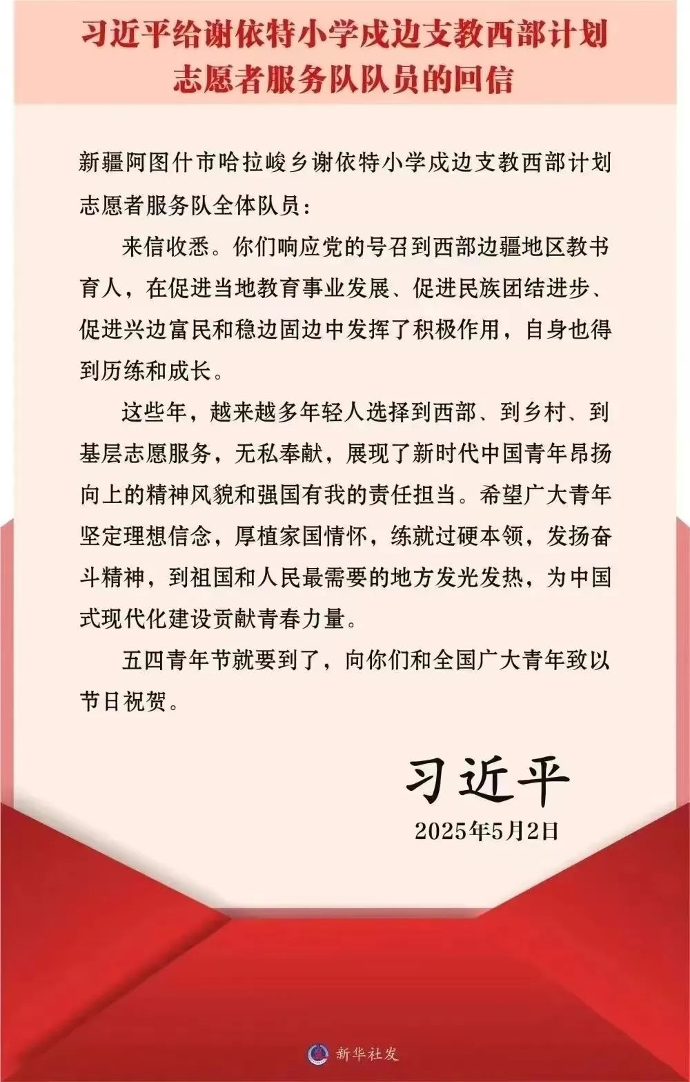 习近平总书记给谢依特小学戍边支教西部计划志愿者服务队全体队员的回信肯定了他们的贡献,鼓励志愿者的同时也寄予了青年期望。作为新时代青年,我们应深悟回信精神,坚定理想信念,厚植家国情怀,将个人成长与国家命运相连,奔赴祖国需要的地方,以青春汗水浇灌祖国大地,在奉献中实现人生价值,为中国式现代化建设添砖加瓦,让青春在全面建设社会主义现代化国家的火热实践中绽放绚丽之花。