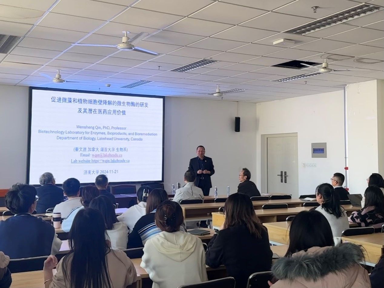 11月21日,加拿大湖首大学(Lakehead University)终身教授秦文胜应邀来冰球突破mg正规官网开展交流,并以“促进微藻和植物细胞壁降解的微生物酶的研发及其潜在医药应用价值”为主题作学术报告,学院教师、学生代表参加活动。报告会由副院长李强主持。