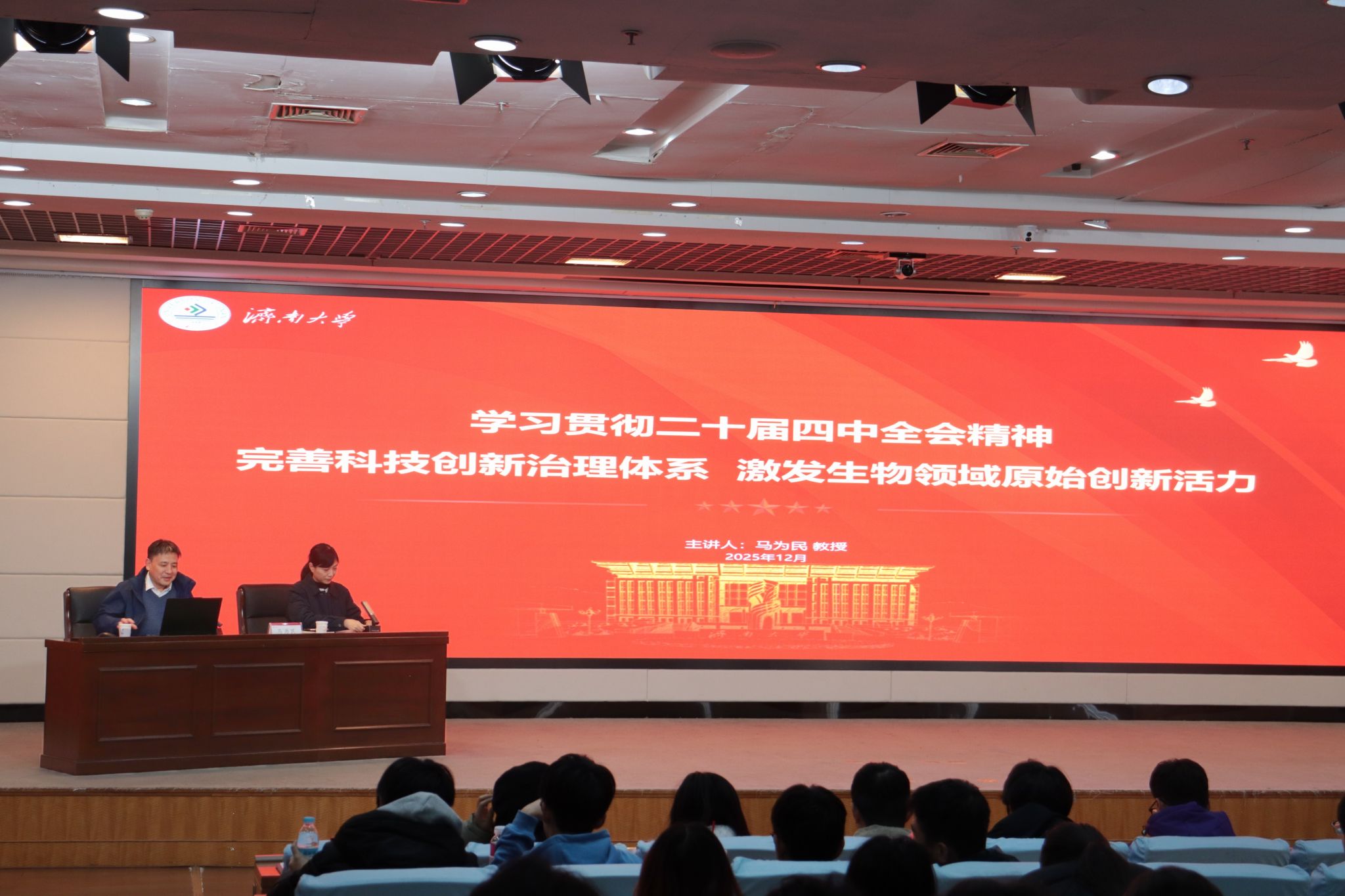 为深入学习贯彻党的二十届四中全会精神,系统把握“十五五”时期的指导思想、目标任务与战略部署,切实把思想和行动统一到党中央决策部署上来,以高水平学习成效赋能学院高质量发展,12月23日下午,冰球突破mg正规官网在第一学术报告厅举办“泉城大讲堂”主题报告会。本次报告会特邀中国藻类学会常务理事、全国光合作用专业委员会委员、上海市一碳生物技术专委会副主任马为民教授主讲。学院师生党员代表、“青马工程”学员、入党积极分子以及2025级全体学生参加。报告会由学院党委副书记、副院长杜艳主持。