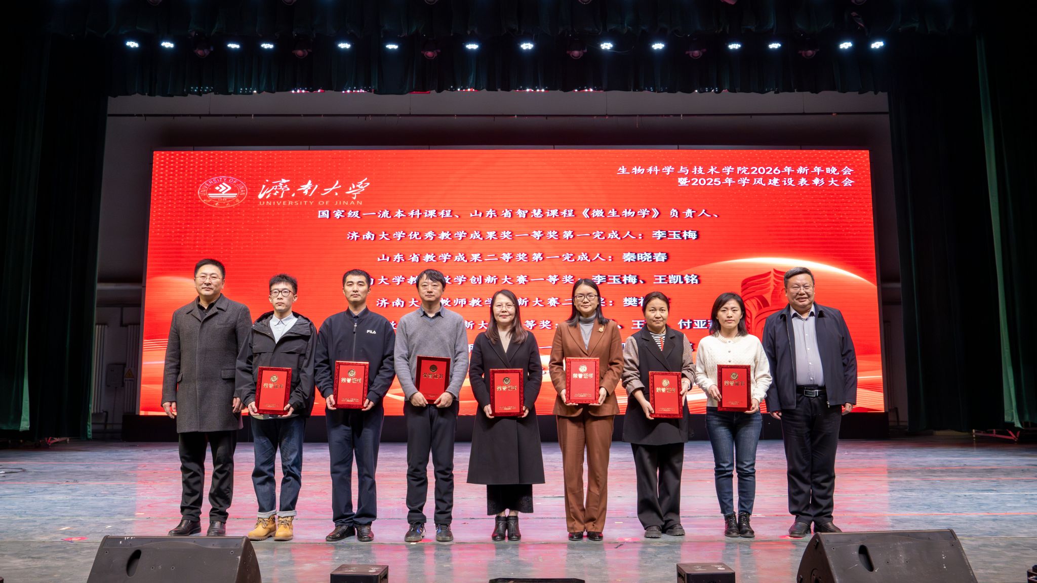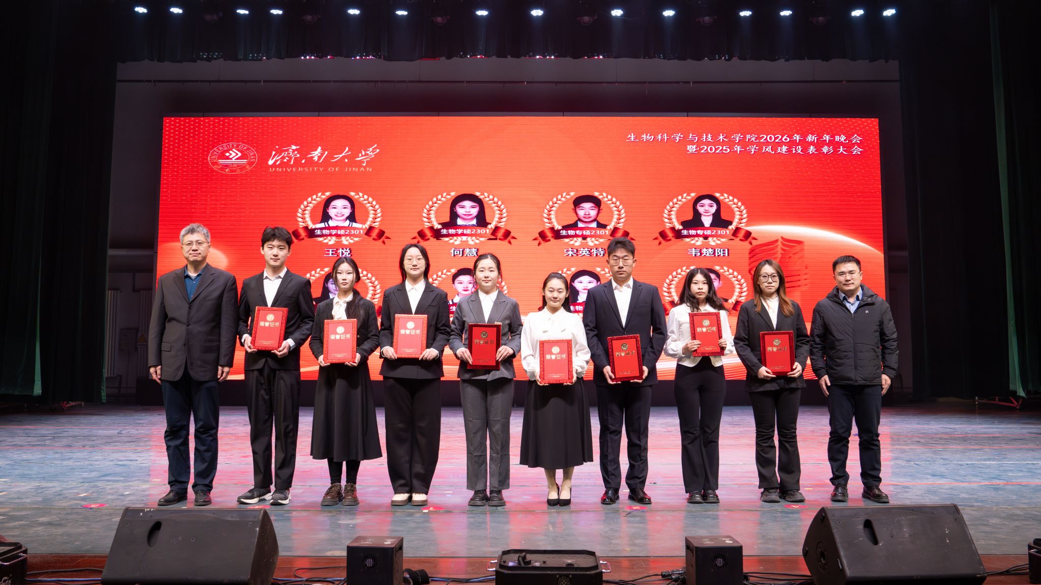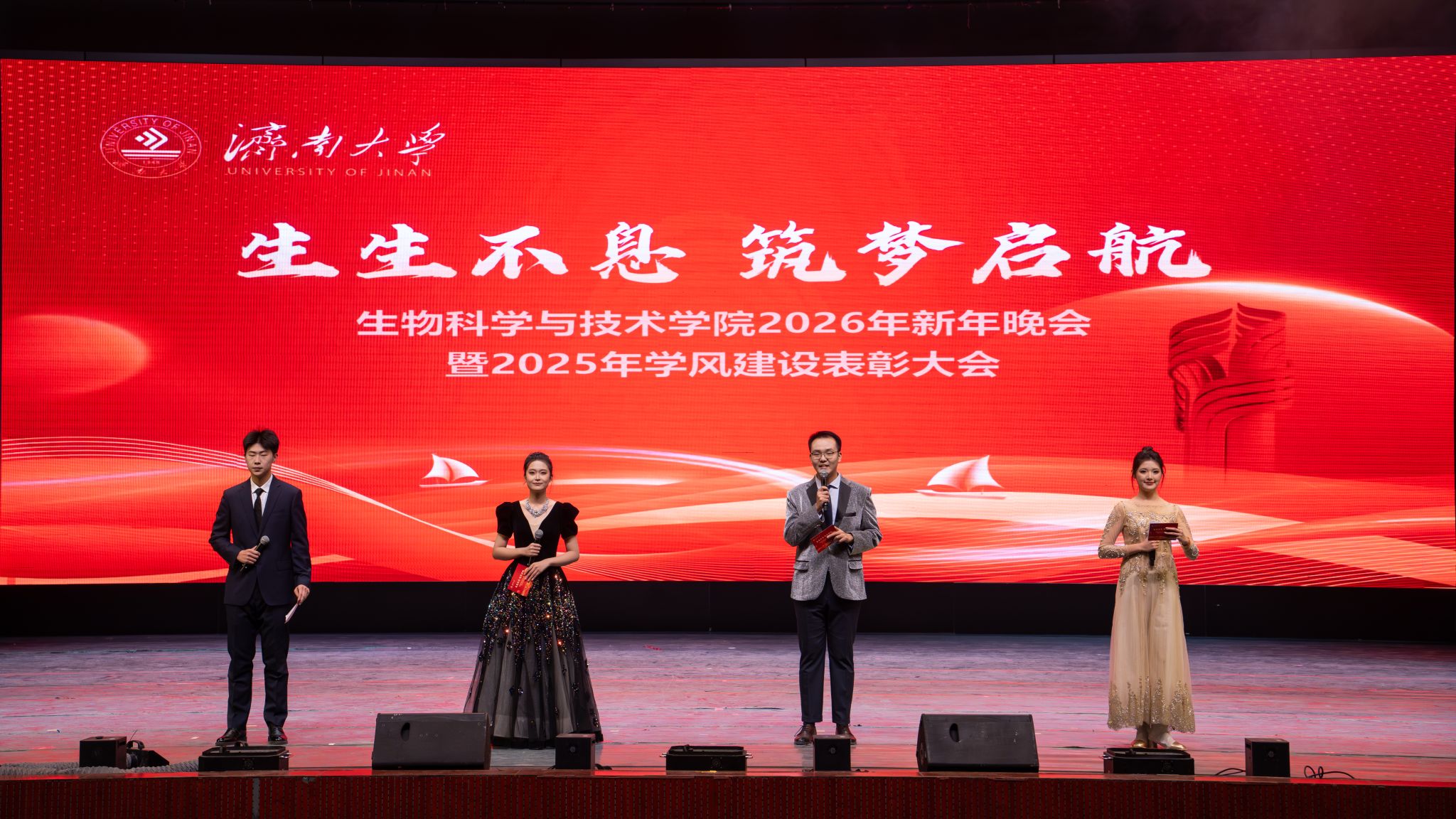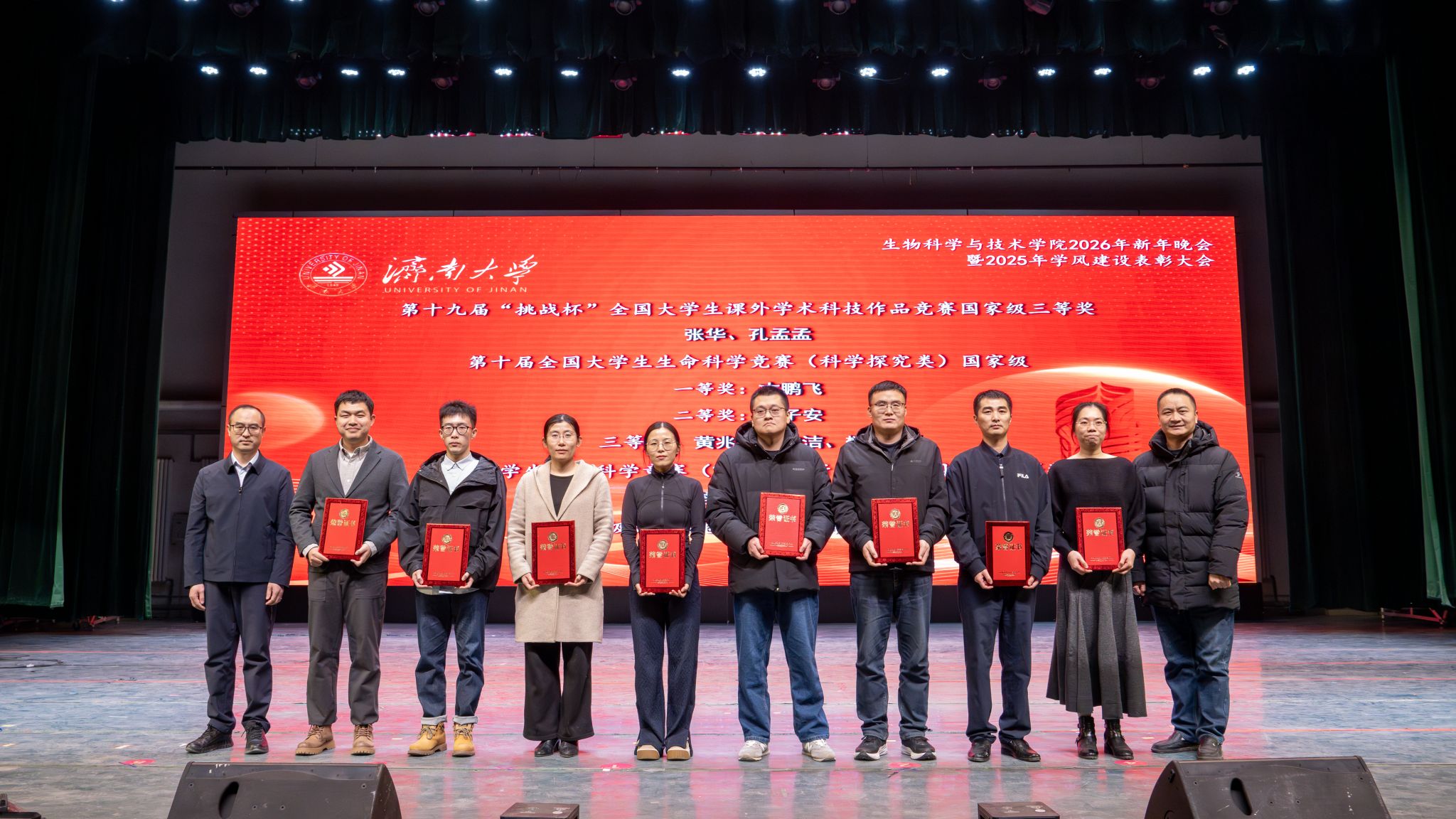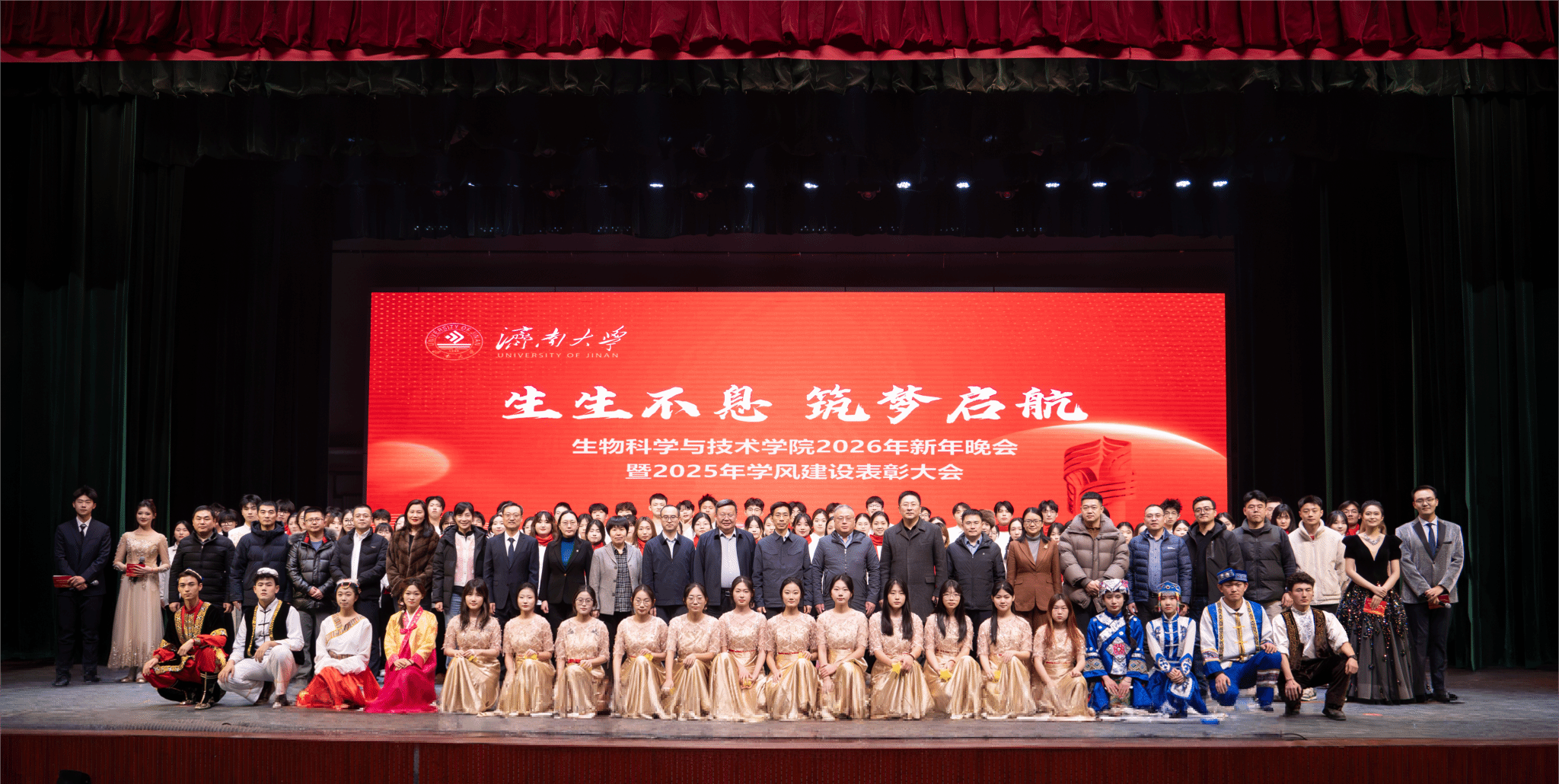 弦歌不辍,薪火相传。本次新年晚会暨学风建设表彰大会既是一场精彩纷呈的视听盛宴,更是一次涤荡心灵的精神洗礼、凝心聚力的生动实践,生动展现了冰球突破mg正规官网深耕立德树人、坚持开拓创新的丰硕成果,更彰显出全院师生团结奋进、追求卓越的精神风貌。站在2026年的崭新起点,全体生科人必将以更加饱满的热情、更加昂扬的斗志、更加务实的作风,策马扬鞭、勇毅前行,共同擘画学院发展的宏伟蓝图,为学校高质量发展凝聚共识、汇聚合力,为强国建设、民族复兴贡献生科智慧与力量。